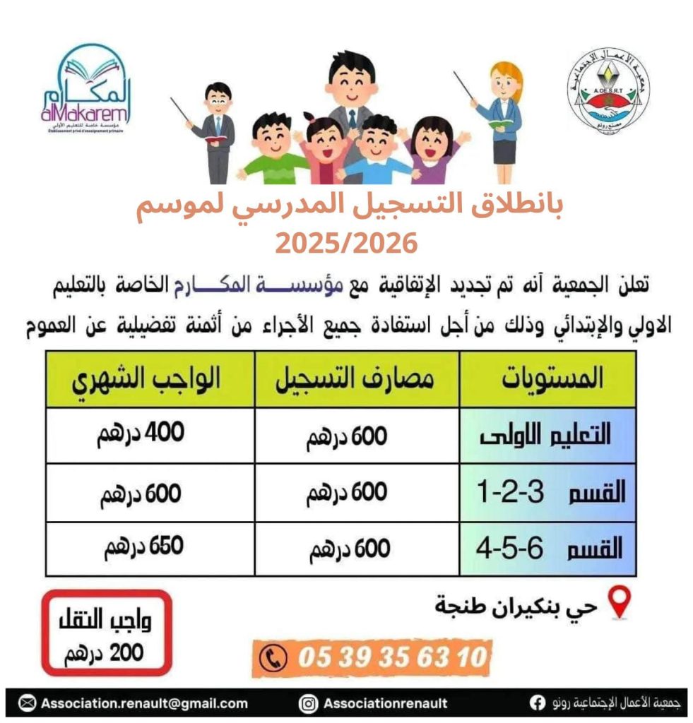 تعلن الجمعية أنه تم تجديد الإتفاقية مع مؤسسة المكارم الخاصة بالتعليم الأولي والإبتدائي وذلك من أجل إستفادة جميع الأجراء من أثمنة تفضيلية عن العموم